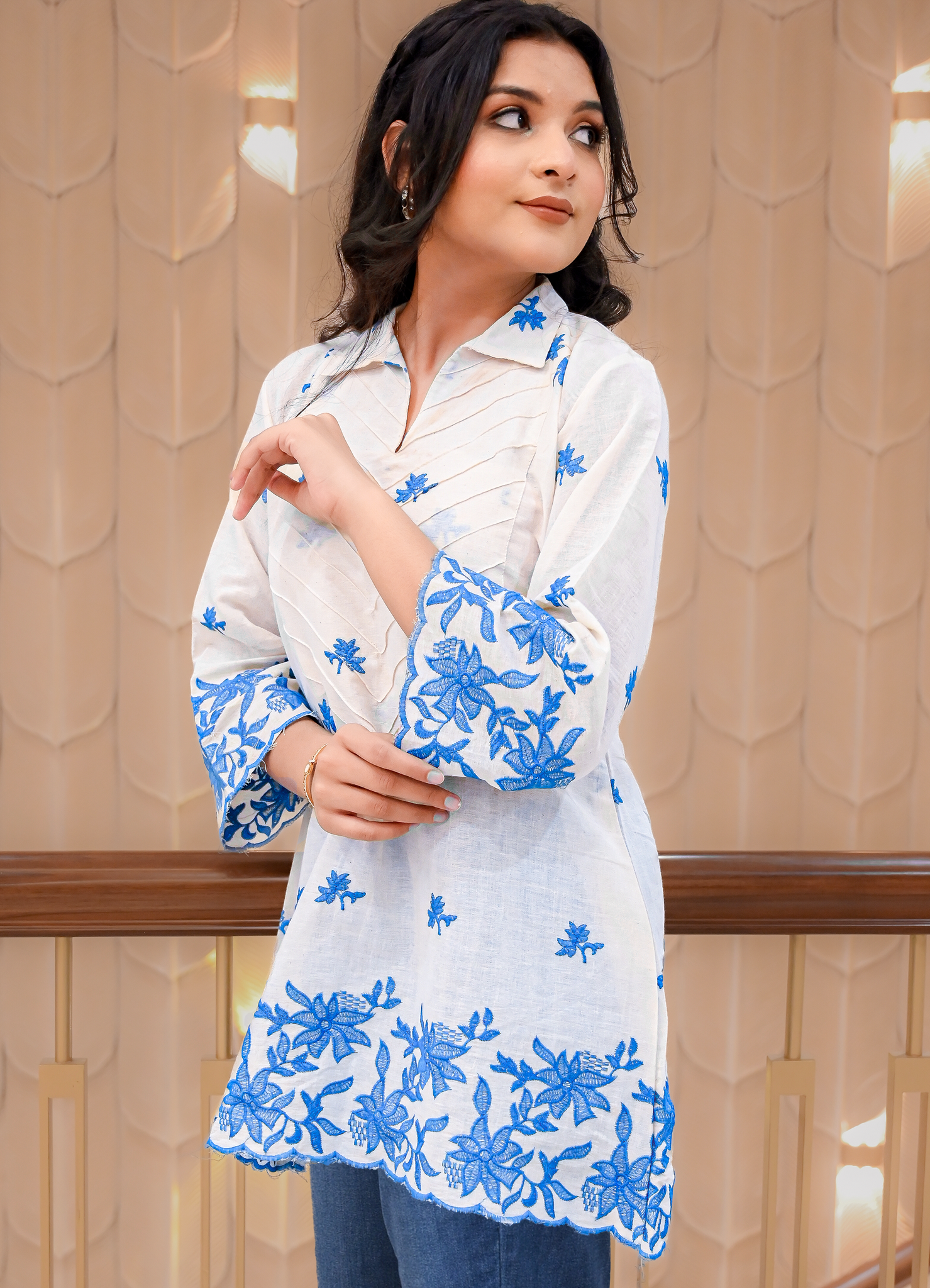 A chic and breezy cotton kurta featuring intricate blue floral embroidery on the hemline, sleeves, and scattered motifs across the bodice. Designed with a smart V-slit neckline and chevron stitch detailing on the front, this kurta blends elegance with everyday comfort.