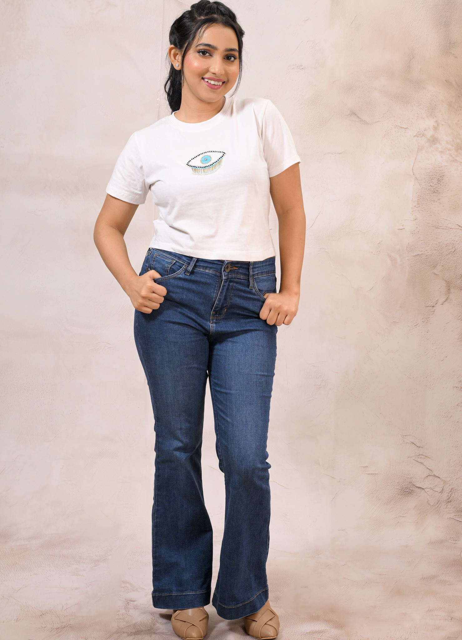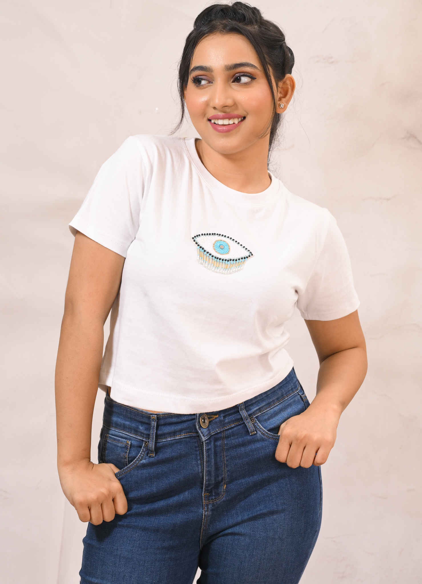 Women’s White Cotton Fitted Crop T-Shirt with Evil Eye Embroidery Patch