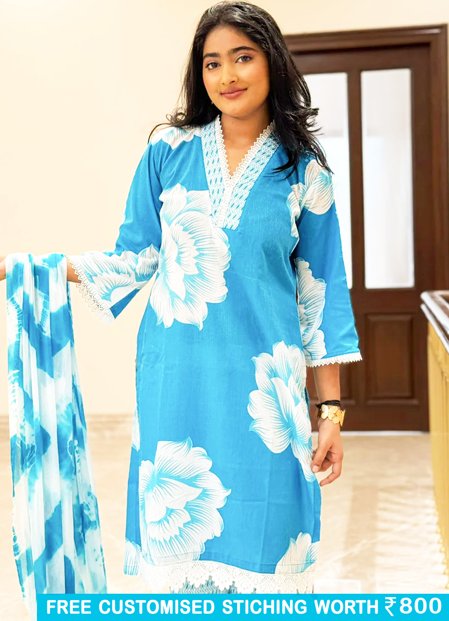 - Kurta: Straight fit with floral hand-block inspired print and lace trim