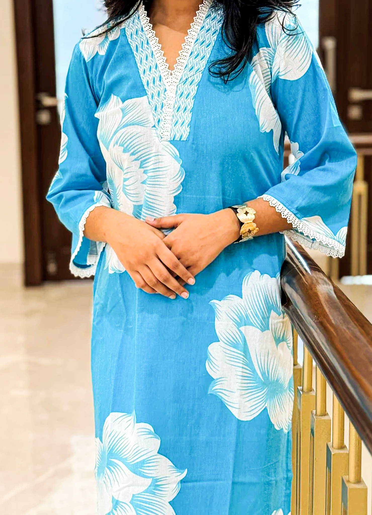 - Design: V-neck with lace work, three-quarter sleeves