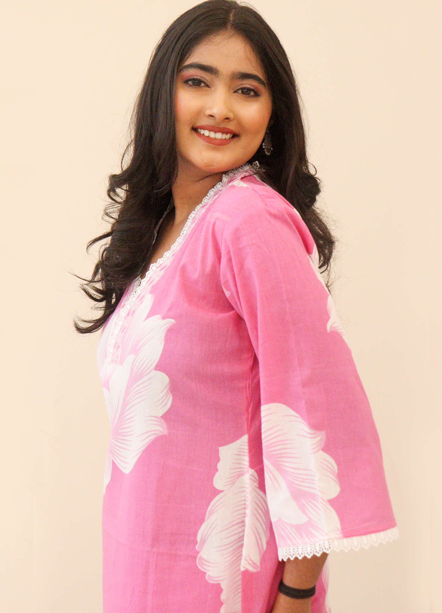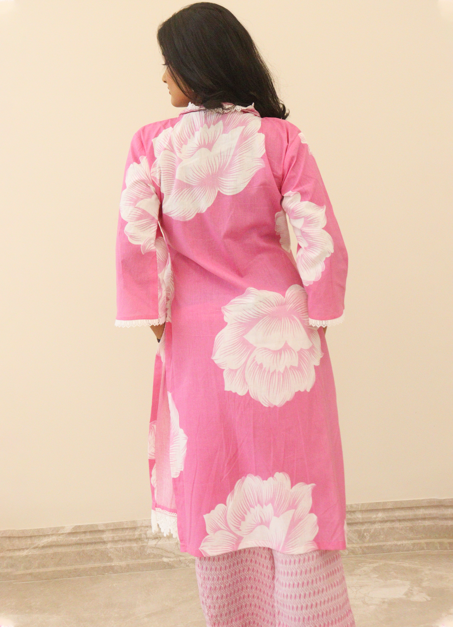 Our Blush Bloom Printed Cotton Cord Set exudes simple elegance. This set is made of high-quality, breathable cotton and features a lively pink kurta with big white floral designs. The kurta, which features exquisite lace detailing at the neckline and sleeve hems, strikes the perfect balance between heritage and modernity. This ensemble, paired with matched printed pants, is both stylish and comfortable, making it suitable for informal brunches, celebratory events, and easy evening outings.