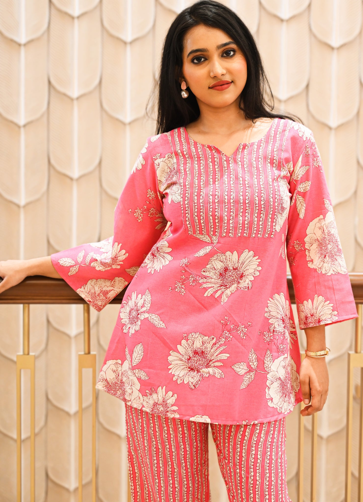 Our Summer Bloom Co-ord Set, which is made of superior stretchable Cotton for unparalleled comfort, will add flair to your regular wardrobe. This two-piece combination, which includes a bright pink floral blouse and striped matching slacks, is ideal for work-from-home style, brunches, and casual get-togethers. For hot Indian summers, the 3/4 sleeves, flowy silhouette, and soft, breathable fabric make it the perfect choice.