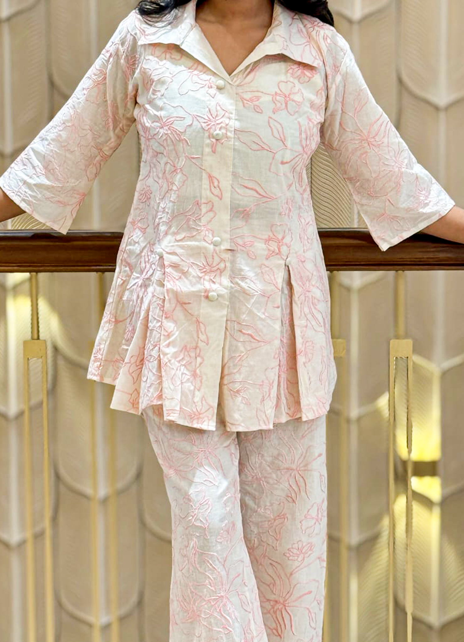 Gracefully elegant and effortlessly chic — the Rose Whisper Pleated Cotton Co-Ord Set is your go-to choice for breezy days and refined casual looks. Tailored from 100% pure cotton, the ensemble features soft pastel embroidery that evokes the subtle charm of hand-drawn florals. The top comes with a pleated flare, button-down front, and 3/4th sleeves for a flattering, flowy silhouette. Paired with relaxed-fit pants, this set ensures all-day comfort with a refined finish.