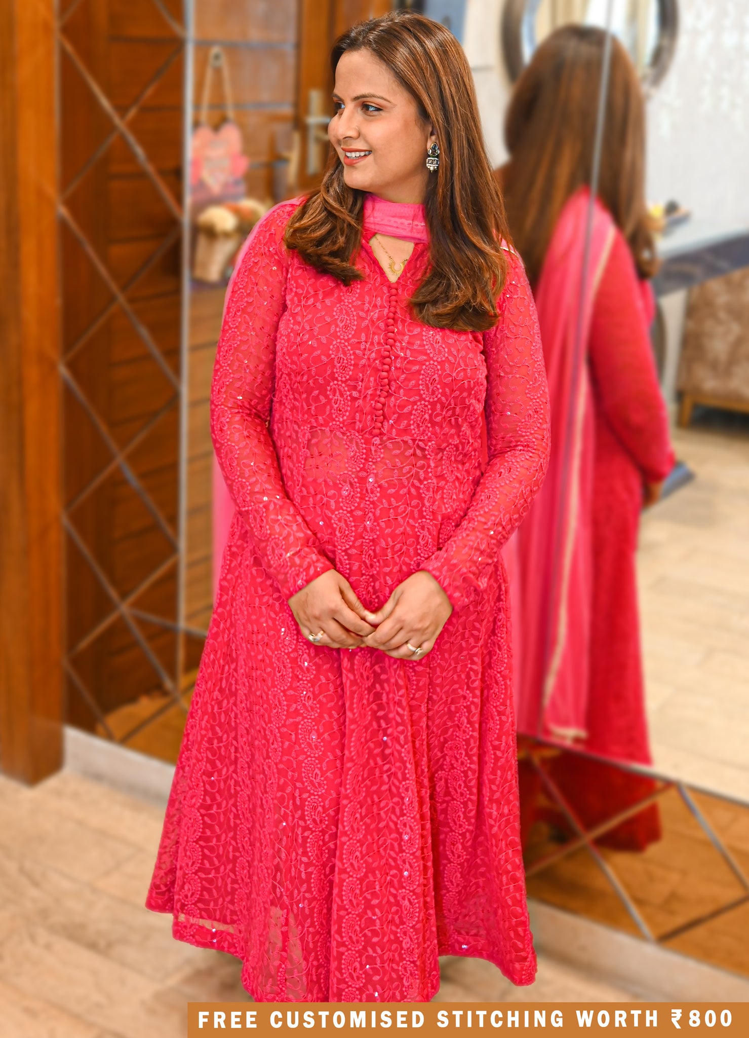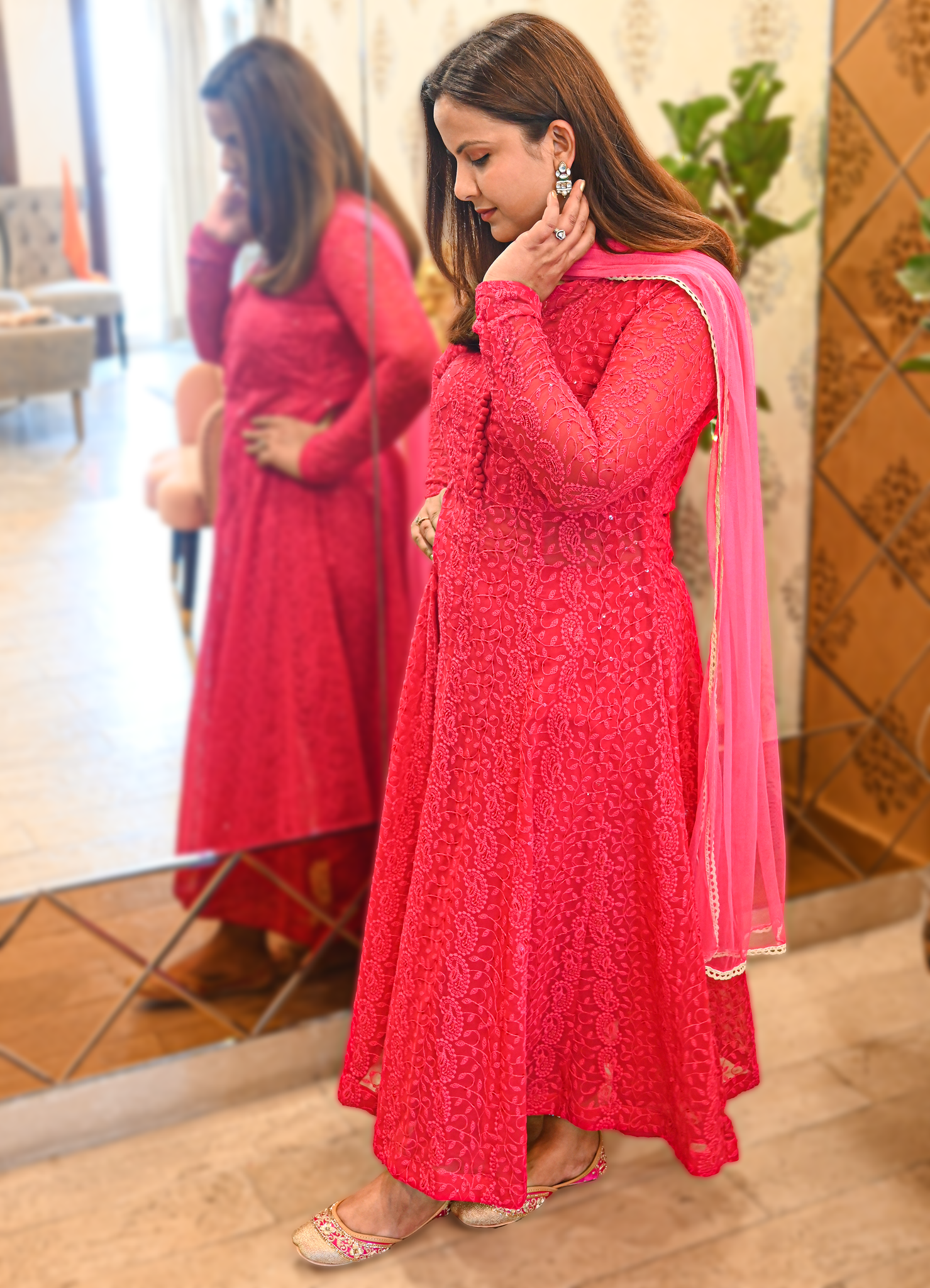 Pink Georgette Chikankari Anarkali Set with Chiffon Dupatta