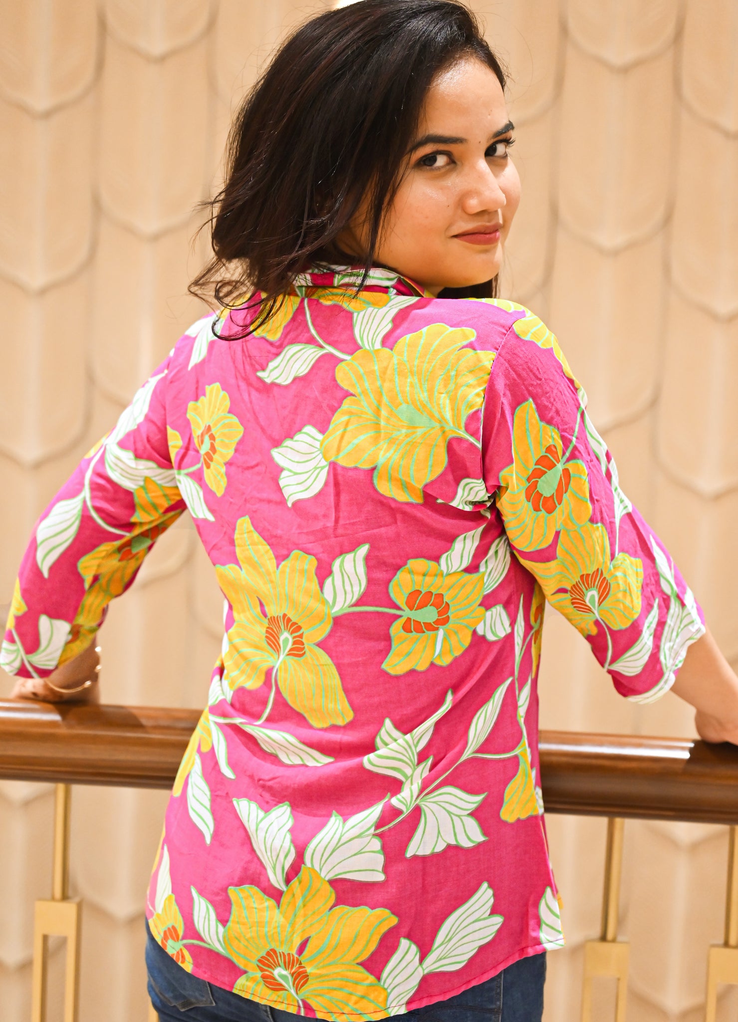 This vivid and breathable summer wardrobe essential, the Pink & Yellow Floral Printed Pure Cotton Shirt Top, will add some color to your everyday ensemble. With its button-down front, structured collar, and lovely floral print, this top, which is tailored from premium quality pure cotton, offers the ideal balance of comfort and style.