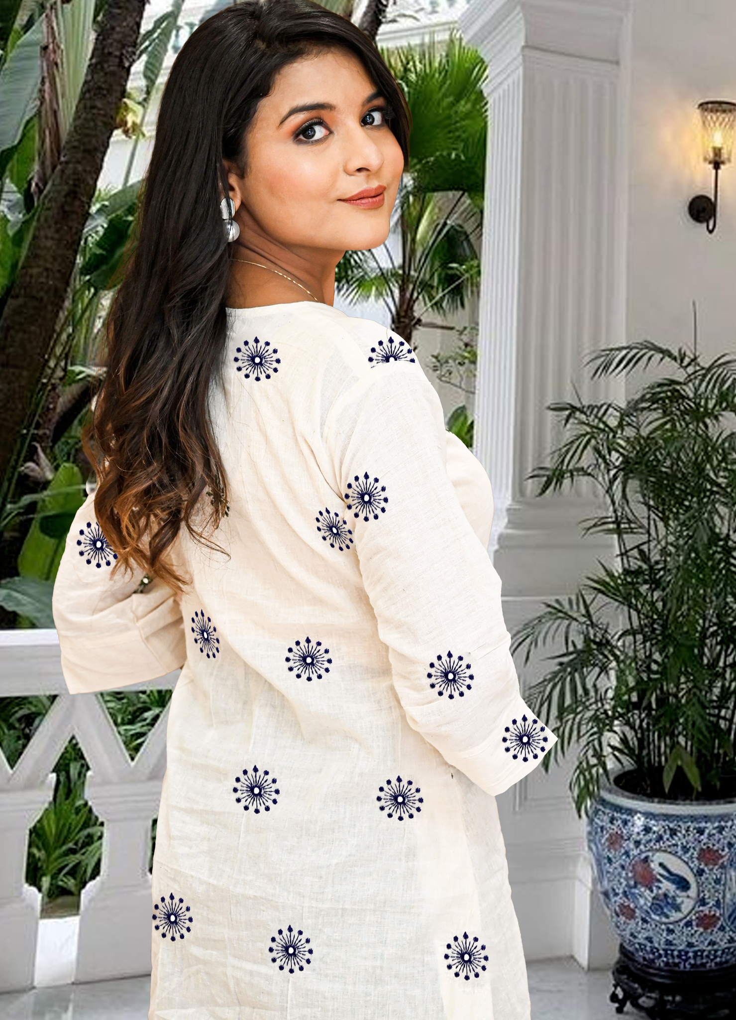 This off-white pure cotton top with delicate Blue embroidery will add a refreshing touch to your summer outfit. This breathable, lightweight blouse is made of soft, pure cotton and features delicate thread embroidery in a flower design for comfort and style.