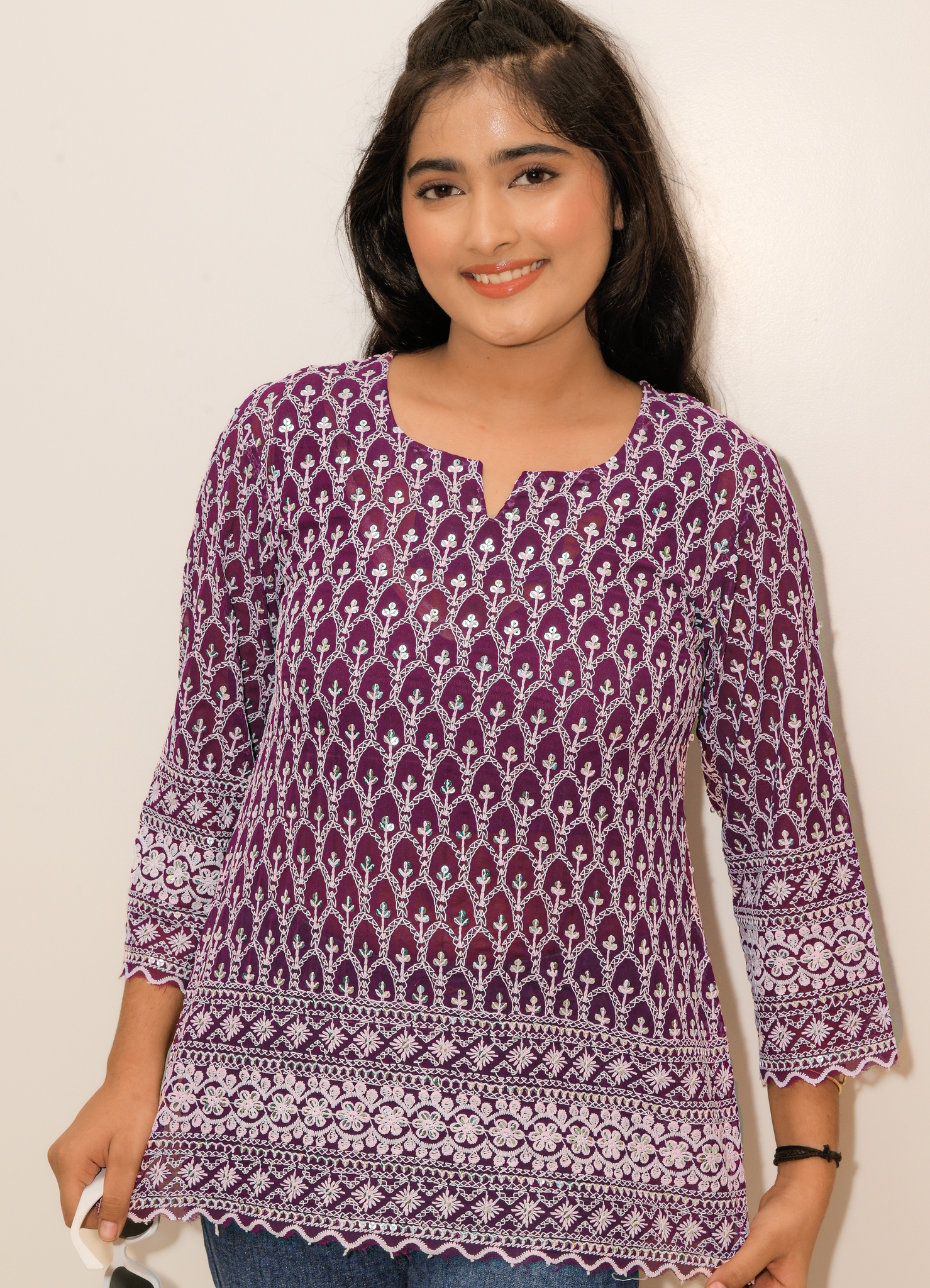 With this sophisticated short kurta top made of breathable, silky embroidered georgette, you can effortlessly add elegance to your daily look. It is a striking option for semi-formal gatherings as well as informal get-togethers because of its deep plum color, which is accentuated with fine thread embroidery and delicate mirror details.