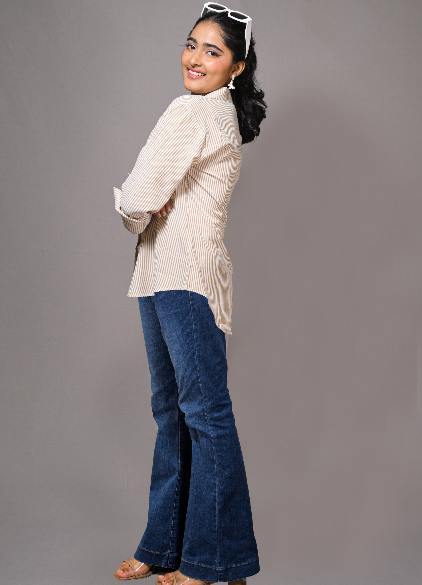 Elevate your everyday style with this effortlessly chic beige and white striped cotton shirt. Designed with a relaxed fit and breathable fabric, this button-down shirt offers all-day comfort while keeping you on-trend. Featuring a classic collar, front patch pocket, and stylish rolled-up sleeves, it’s perfect for layering over a tank top or wearing on its own. Pair it with jeans, trousers, or skirts for a versatile look that transitions seamlessly from work to weekend outings.