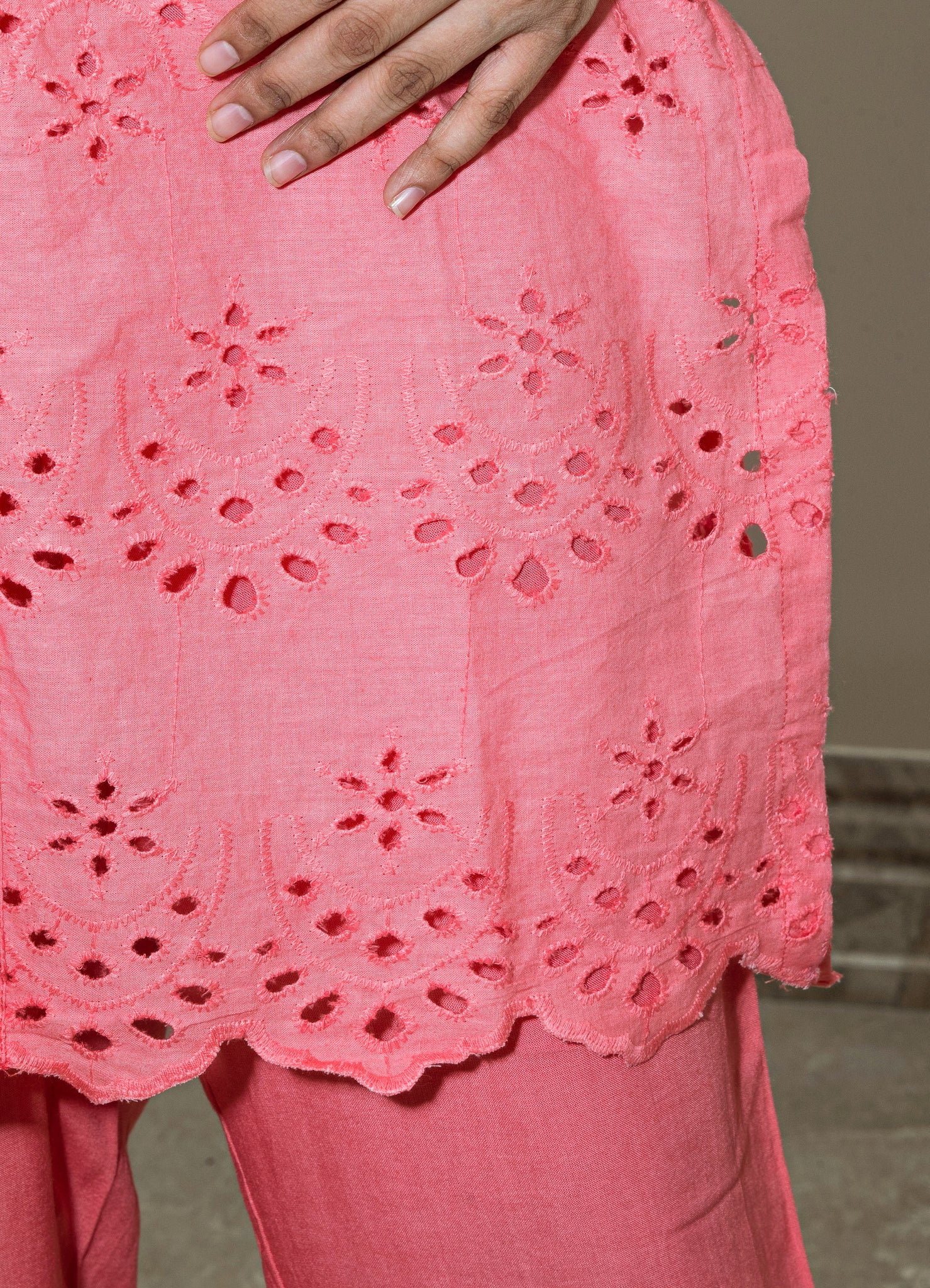 Our classic 3-piece peach Cotton Chikankari Co-ord Set lets you make a striking statement. This elegant outfit is crafted from breathable cotton and showcases all-over Chikankari-style eyelet embroidery on the top, along with scalloped edges and flared sleeves. When combined with peach trousers and a coordinating undershirt, it offers an ideal mix of ease and ethnic elegance for celebrations, formal occasions, or nighttime events.