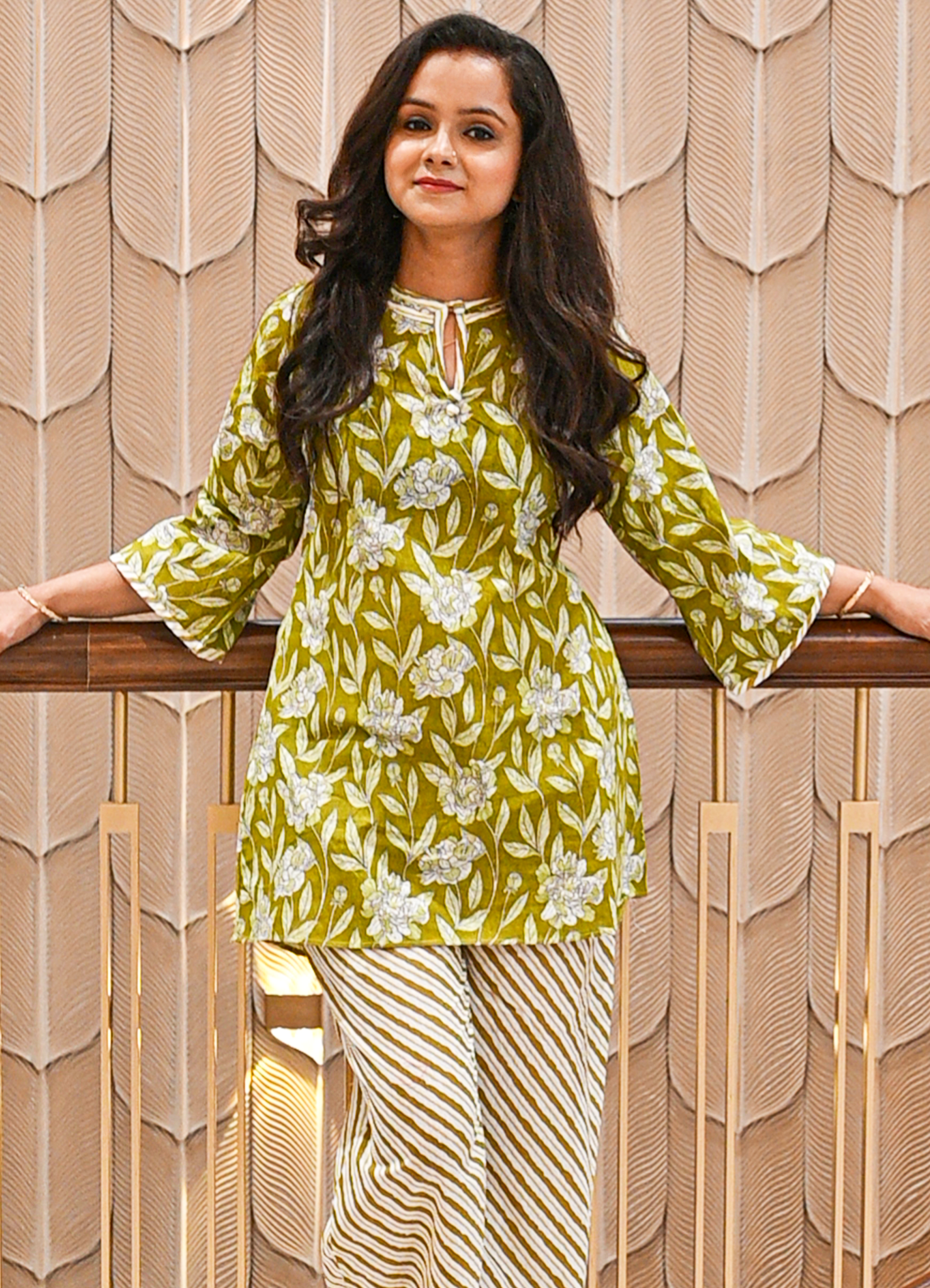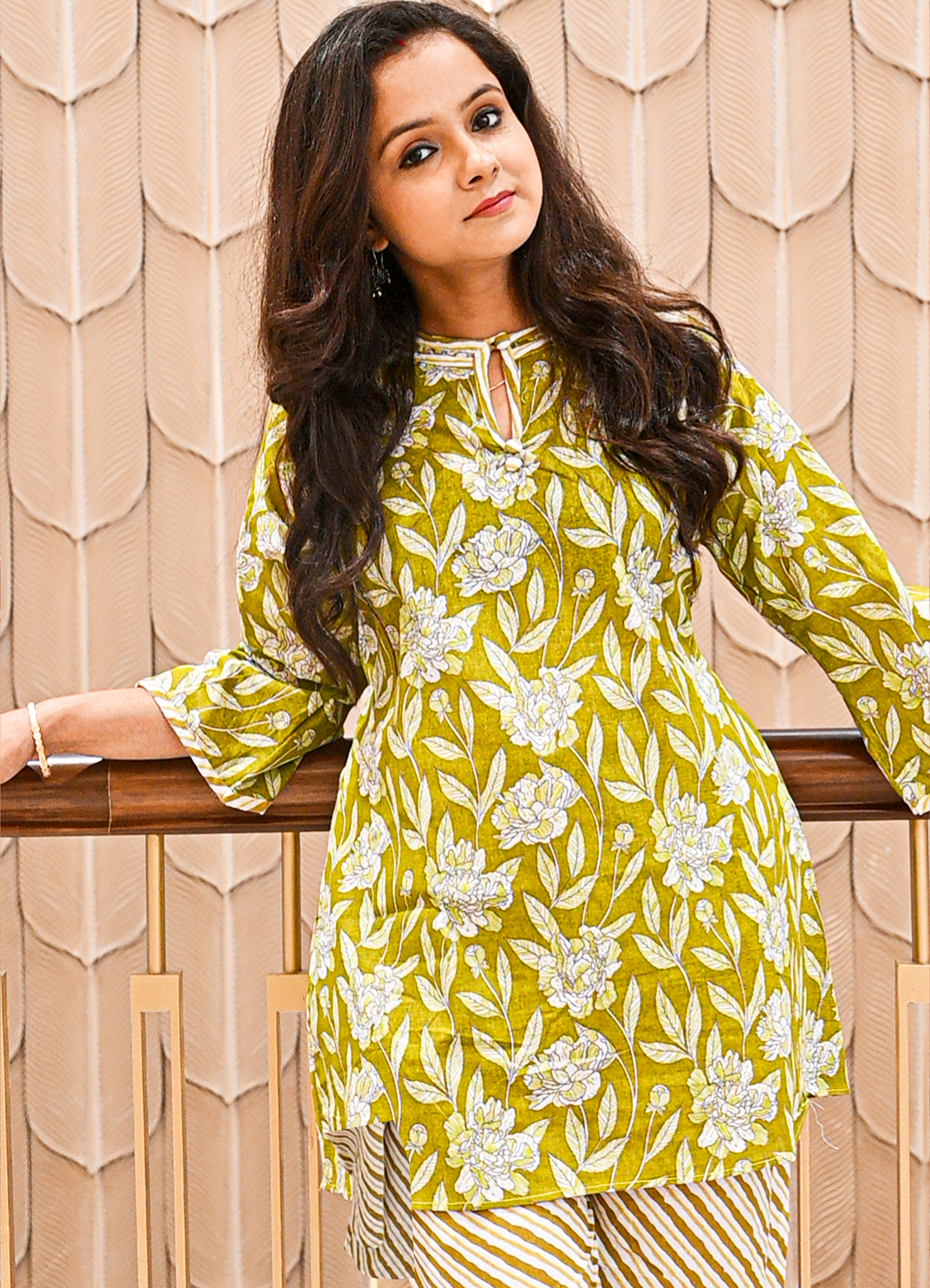 The floral design pure cotton co-ord set adds a light, fashionable touch to your regular ethnic wardrobe. A bright blue floral-printed kurta and contrast-striped cotton slacks create a contemporary fusion ensemble in this breezy cotton ensemble. Perfect for summertime trips, brunches, and workwear.